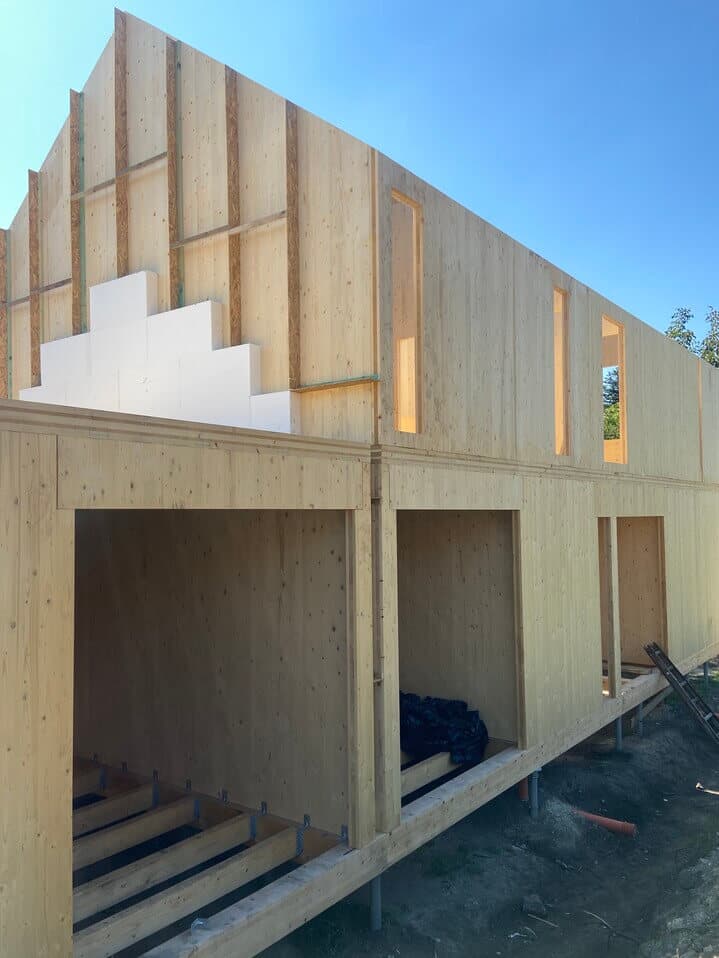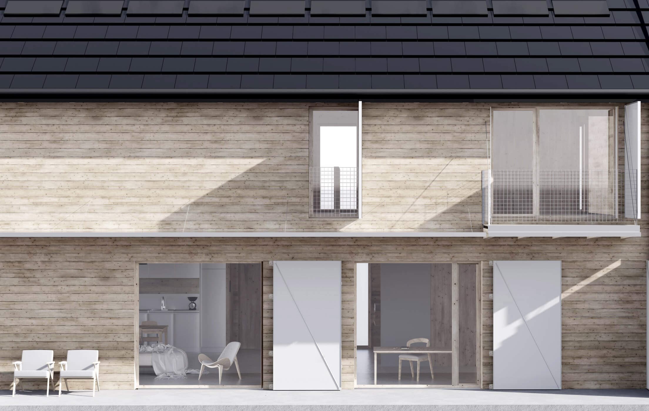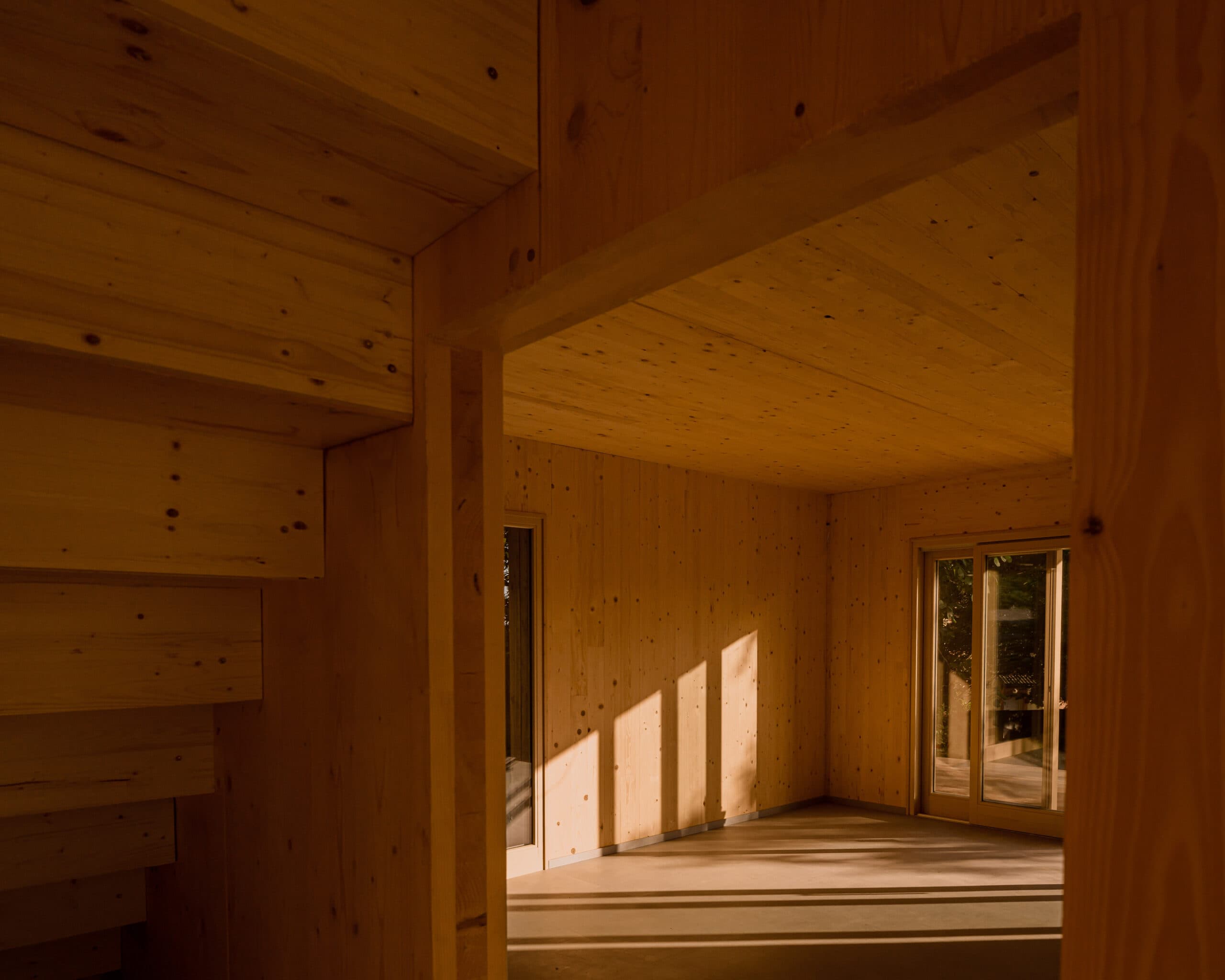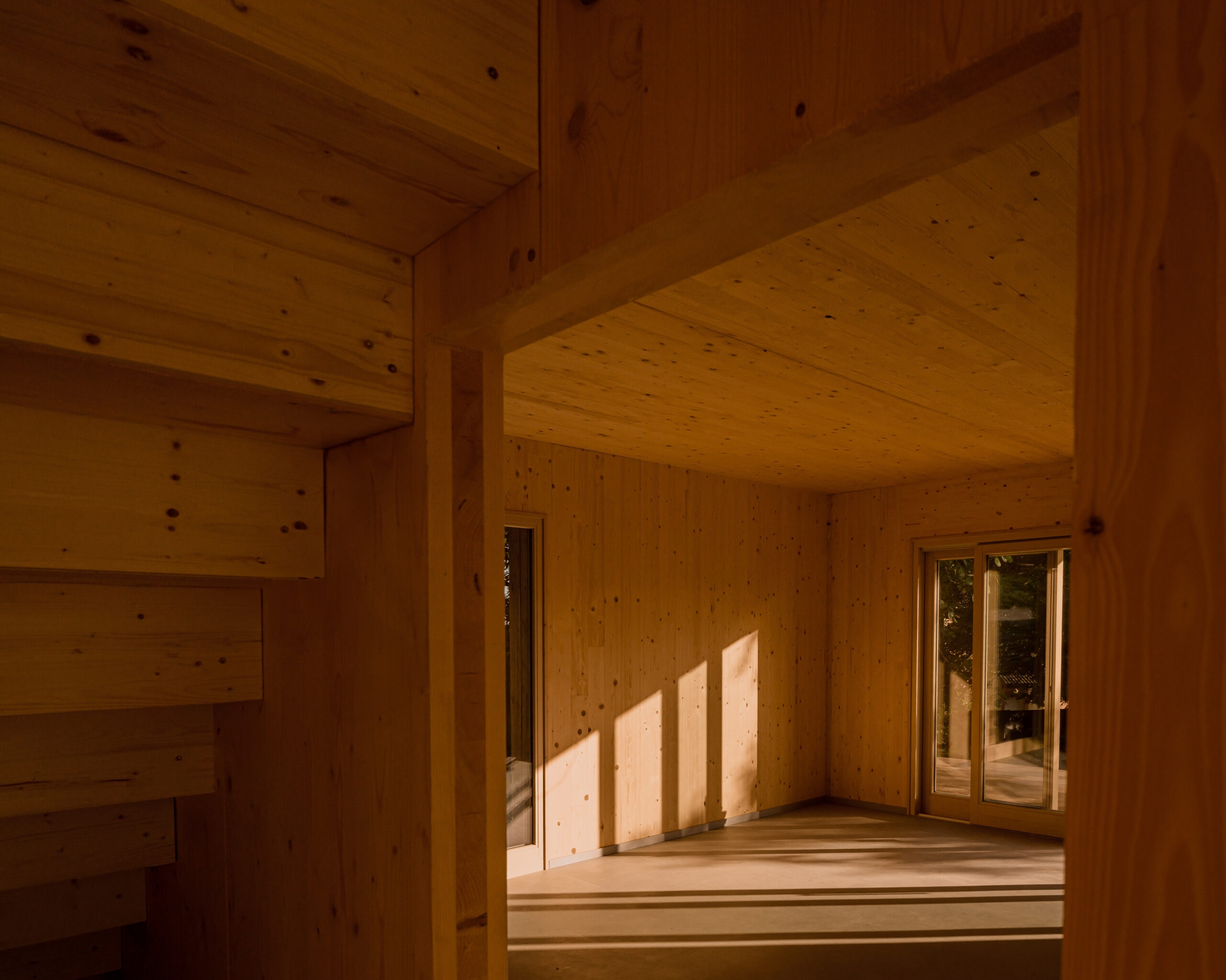 In order to minimise the environmental impact of the project and achieve a negative carbon footprint while applying circular economy thinking, we have further developed our EquinoxTM-System and not only created the super-structure out of CLT, but also replaced concrete foundations with earth screws, allowing for complete disassembly of the building at the end of its life-cycle. Throughout a 60-year life cycle of the building, this results in a negative carbon footprint of -23514 kgCO2e (150 kgCO2e/m2). Even though the associated embodied carbon (A1-A5, B1-B5, C1-C4) is 40380 kgCO2e (258 kgCO2e/m2), the total results are negative thanks to the biogenic carbon storing 63894 kgCO2e (408 kgCO2e/m2). The Life Cycle Analysis (LCA) was conducted using One Click LCA.