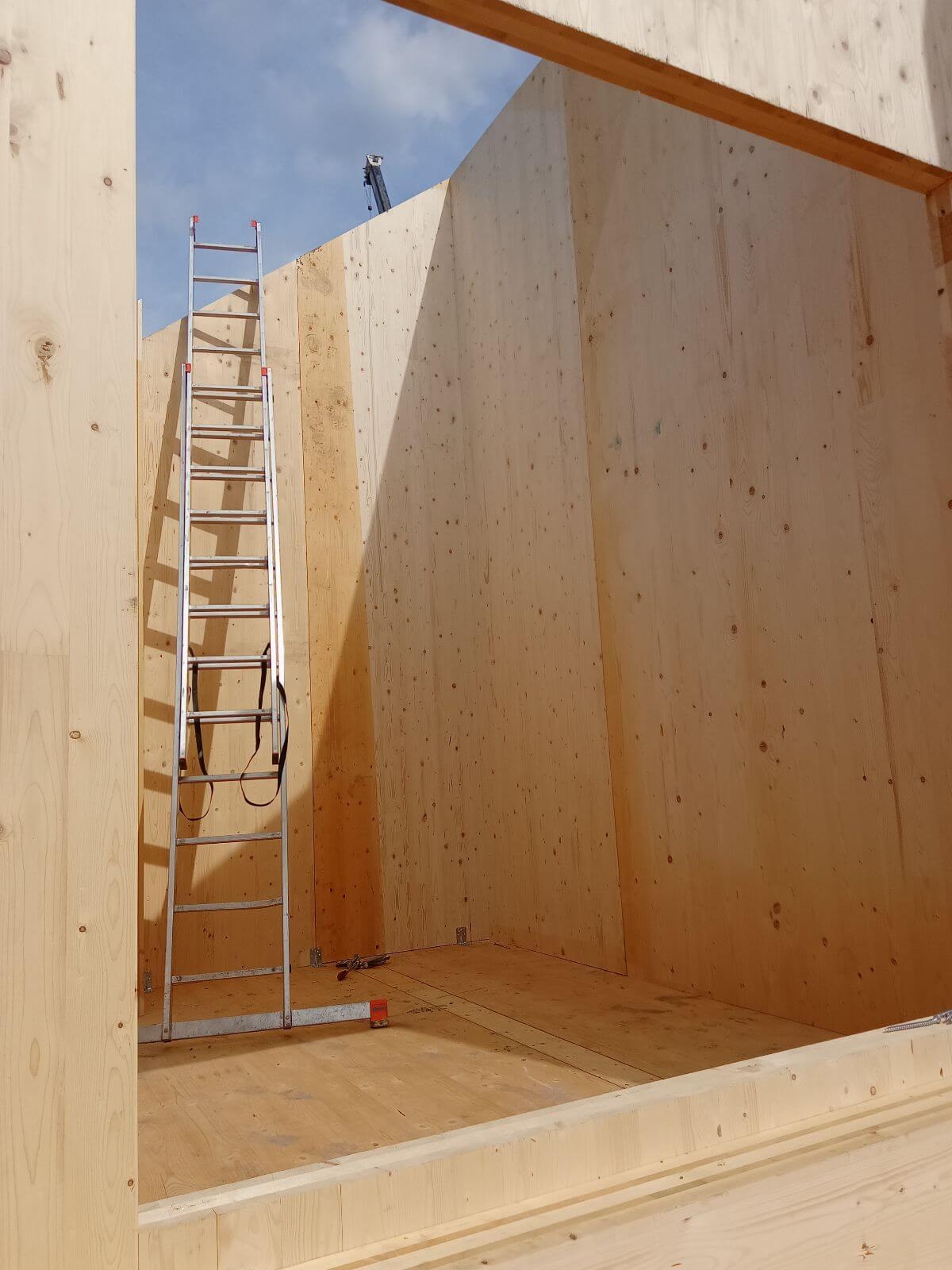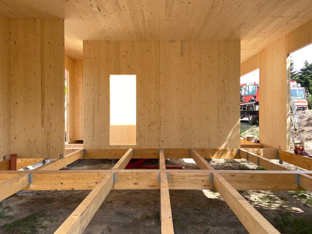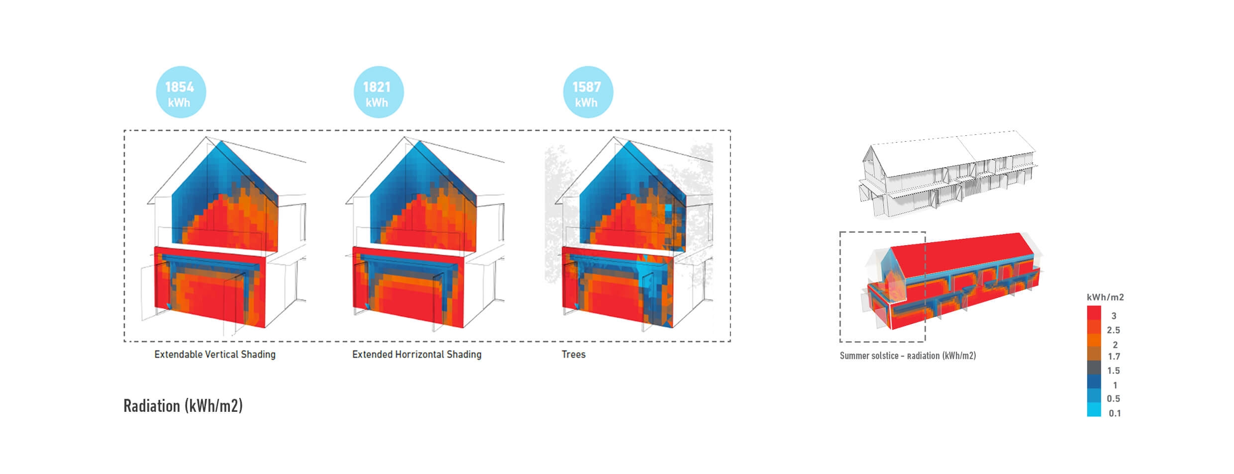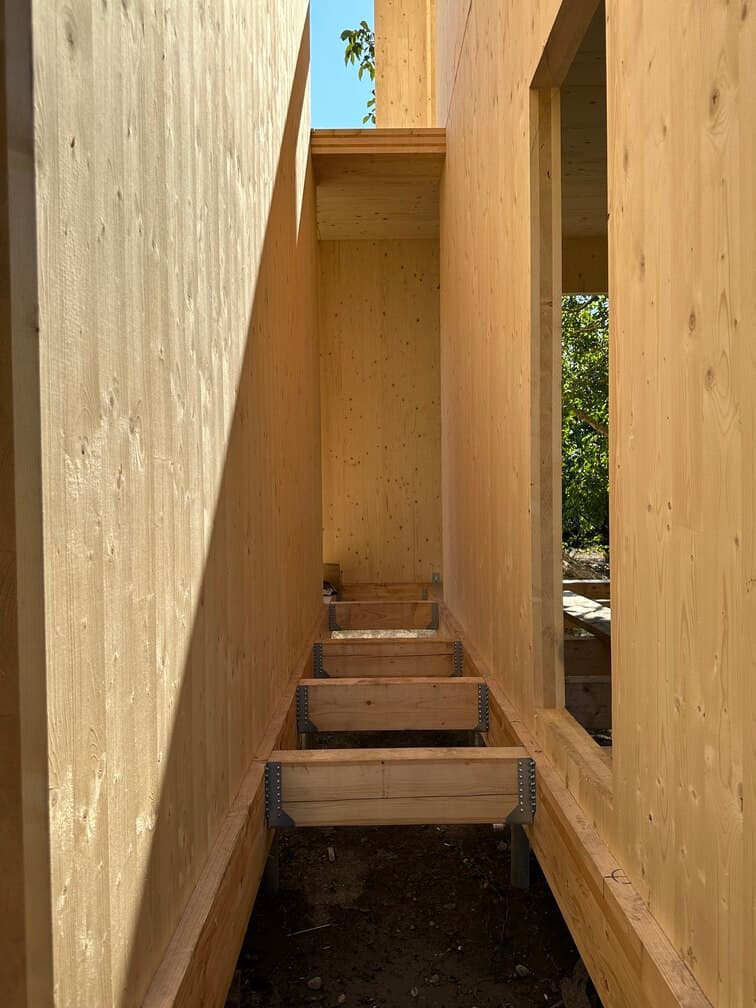 In order to minimise the environmental impact of the project and achieve a negative carbon footprint while applying circular economy thinking, we have further developed our EquinoxTM-System and not only created the super-structure out of CLT, but also replaced concrete foundations with earth screws, allowing for complete disassembly of the building at the end of its life-cycle. Throughout a 60-year life cycle of the building, this results in a negative carbon footprint of -23514 kgCO2e (150 kgCO2e/m2). Even though the associated embodied carbon (A1-A5, B1-B5, C1-C4) is 40380 kgCO2e (258 kgCO2e/m2), the total results are negative thanks to the biogenic carbon storing 63894 kgCO2e (408 kgCO2e/m2). The Life Cycle Analysis (LCA) was conducted using One Click LCA.