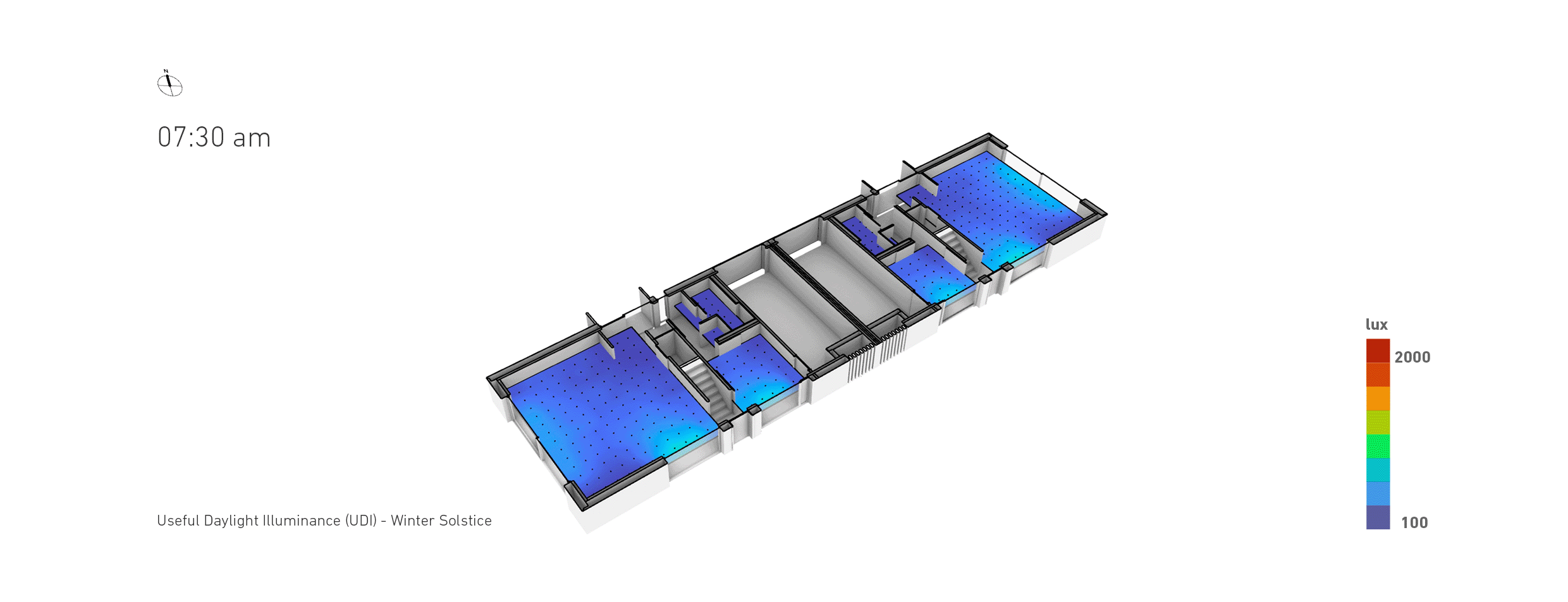 In winter, the passive design strategy entails maximising solar heat ingress by placing louvers along the facade to avoid obstructing sunlight. Low-angle winter sunlight isn't hindered by the fixed canopy anymore. The louver operation is manual and intuitive. A suspended canopy over the terrace screens summer sunlight, and both canopy and louvers contribute to the house's character as well as its climatic function.