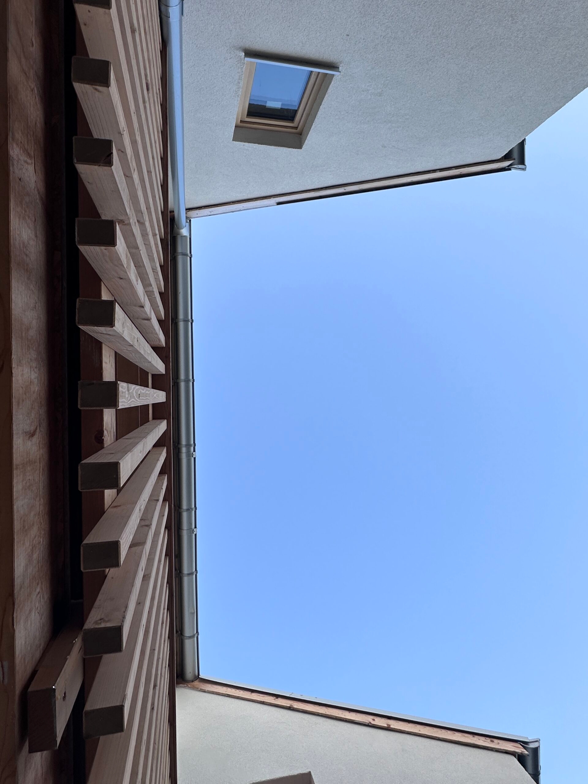 To comply with regulations, the building itself had to be long and narrow, leaving a 2 m wide side garden, and was placed at the back of the plot to maintain a distance from the neighbour's house. The roof slant angle was set at 30 degrees to allow for the placement of skylights facing the neighbour. The building height limit was just enough to place one full height storey under the collar beam above the ground floor.