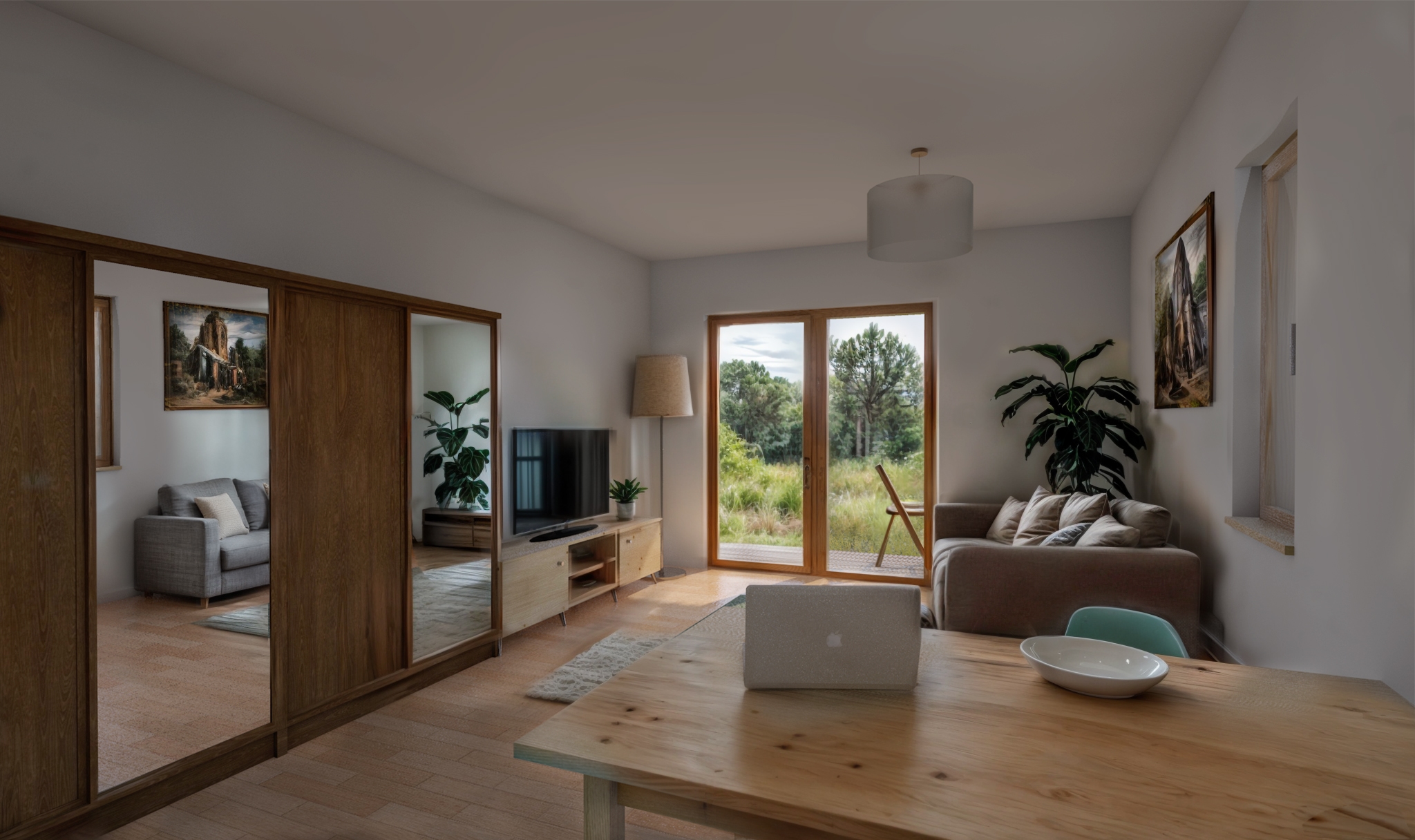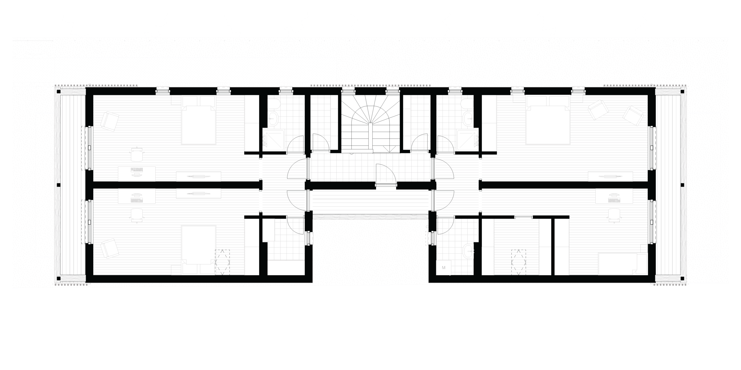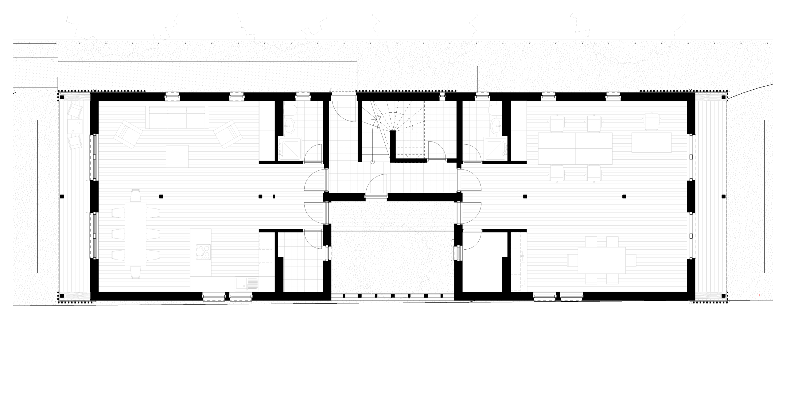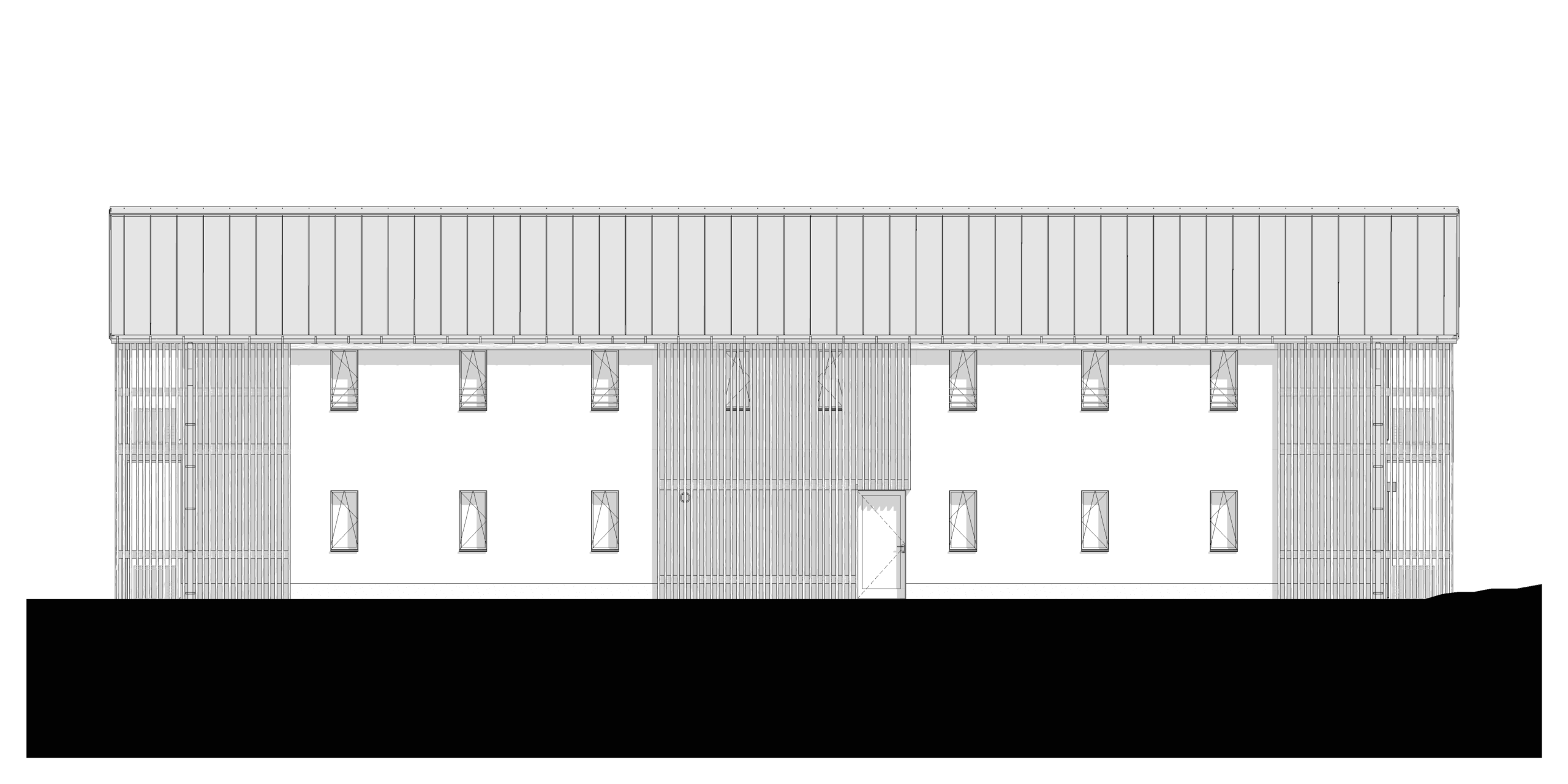 With the side garden so narrow, and a bus station just next to the fence, the house got its largest opening on the narrow facades, connecting the communal places, the office, and the rooms to two bigger patches of gardens. The entrance was placed in the middle of the long facade, where a small circulation area and technical zone open up to the livingroom, kitchen, and dining area complex, to the office on the other side, and to the rooms on the first floor. An atrium was opened in front of the entrance to allow for natural light to enter the smaller technical spaces.