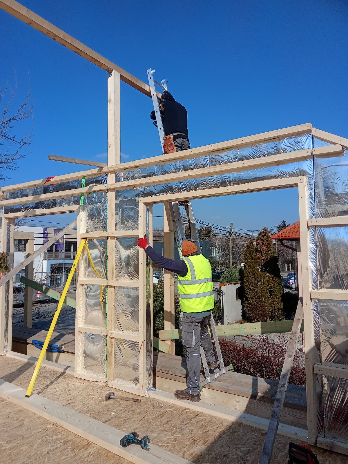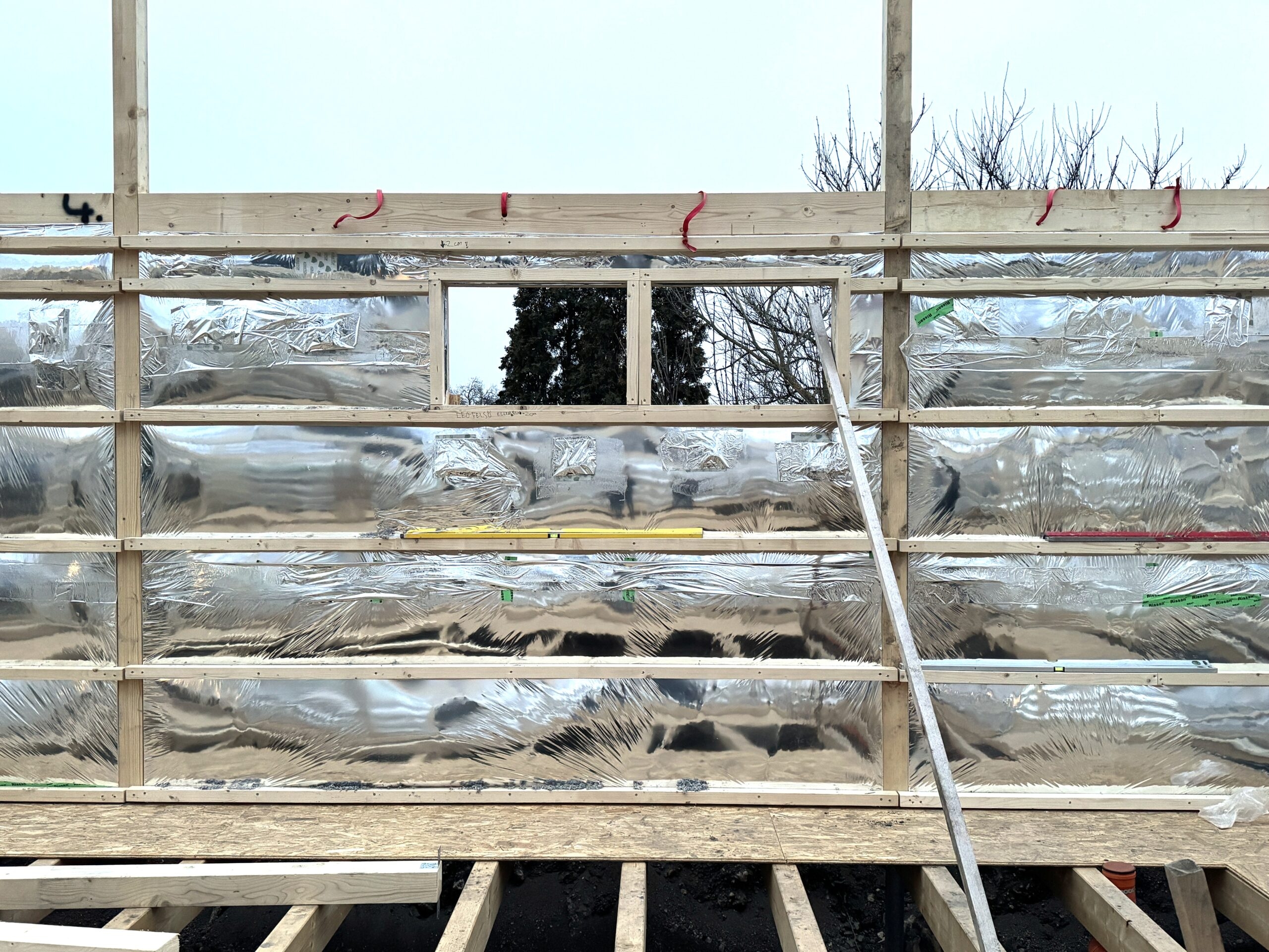 The primary load-bearing material was construction-grade timber, which was integrated into ribbed frames to create structural panels for load-bearing walls. Slabs and the roof were constructed in-situ using single ribs and beams. Cellulose was used as the main insulation material between the ribs. Steel earth-screws were used for the foundation. Facades were given extra insulation, and a warm white stucco screening complemented with pine lamellas for shading and added character.